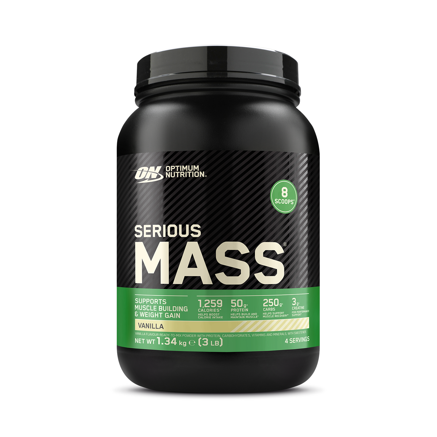 Serious weight gain requires serious calories. Optimum Nutrition Serious Mass is the ultimate weight gain formula. For muscle building and weight gain More than 1260 kcal per serving to help boost your calorie intake 50g protein per serving 25 vitamins & supplements Those who need the extra calories most often have the toughest time consuming enough of them. For many aspiring to be bigger, Serious Mass is the ultimate in weight gain formulas. With over 1,250 calories per serving to boost daily calorie intake, 50g high protein to support muscle growth and repair, over 250g carbohydrates, and now with 3g of added creatine per serving to support performance, you’ve got nothing to lose and lots to gain. It is time to stop thinking small and get serious – SERIOUS MASS. Use anytime, it is quick, convenient and easy to prepare. Serious Mass is ideal between meals, after weight training as part of your recovery routine and before bed. Just mix two scoops of Serious Mass (334g) with 710ml of water to create a tasty, calorie-packed shake.