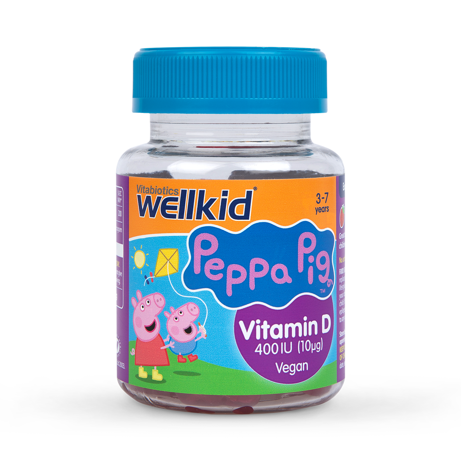 Wellkid Peppa Pig Vitamin D soft jellies provide the exact level of Vitamin D as recommended by the UK Department of Health for young children.Helps maintain health, vitality and wellbeing in growing childrenWellkid Peppa Pig Vitamin D soft jellies have been produced with children's specific needs in mind to provide the exact level of Vitamin D for young children, aged 3-7 years. They come in a delicious natural strawberry flavour.Vitamin D is needed for normal growth and development of bone in children and is included in the preferred form vitamin D3 (as vegan Cholecalciferol) which is naturally produced by the skin when exposed to direct sunlight. Bones get stronger when used and any kind of physical exercise is great for your kids, such as walking, running, dancing, tennis, gymnastics, and football. Children who tend to play outside will also have higher vitamin D levels. Vitamin D also contributes to the normal immune system function in children Kids can be very particular about their likes and dislikes so it is important to give them a supplement that tastes great and that they are happy to take. Wellkid Peppa Pig Vitamin D are premium quality soft jellies that provide the recommended daily amount in a delicious natural strawberry flavour that kids love. These soft jellies are suitable for vegetarians, and vegans too.